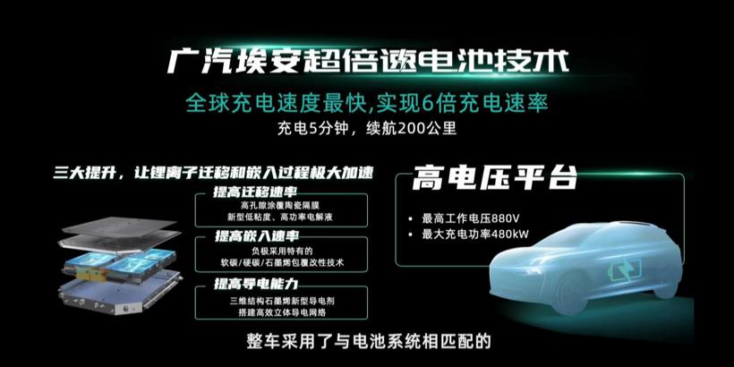 除此之外,广汽埃安还有两个“独门”技术尤为重要。一个是可以稳定量产、成本可控的三维结构石墨烯(3DG)制备技术,以保证导电能力的持续高效;另外一个则是最高工作电压880V的高电压平台,其最大充电功率可达480kW。