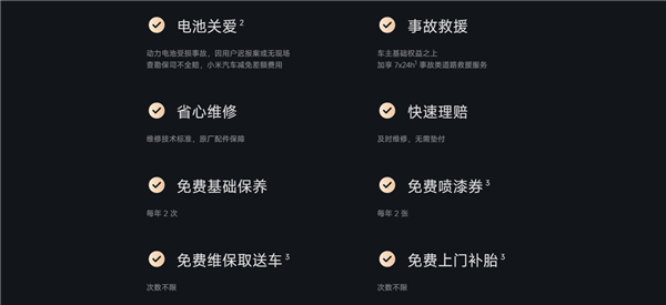 即便是补胎业务,小米汽车提供线下服务车,可以上门服务,且免费不限次。