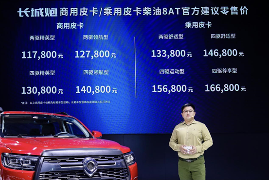 次活动公布了长城炮柴油8AT三款车型的市场售价。其中,长城炮商用皮卡柴油8AT售价区间为11.78万-14.08万元;乘用皮卡柴油8AT售价区间为13.38万-16.68万元;越野皮卡柴油8AT售价区间为17.68万-20.68万元。此外,为满足专业越野车手及改装爱好者需求,长城炮越野皮卡还推出了一款柴油6MT“专业定制版+X”车型,售价15.38万元起,并提供前/后差速锁、绞盘等选配配置。