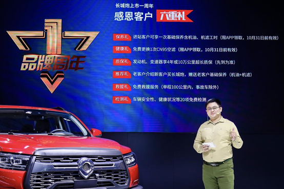 为更好助力时代精英,长城炮率先打造全球化乘用皮卡服务新标准,以全球2500多家销售服务网络为依托,通过质保升级、标准升级、关怀升级、诚信承诺,提升用户服务的效率和满意度。正值上市一周年之际,长城炮再次进行服务升级,推出感恩客户六重礼,为广大消费者带来更优质的用车体验。具体如下: