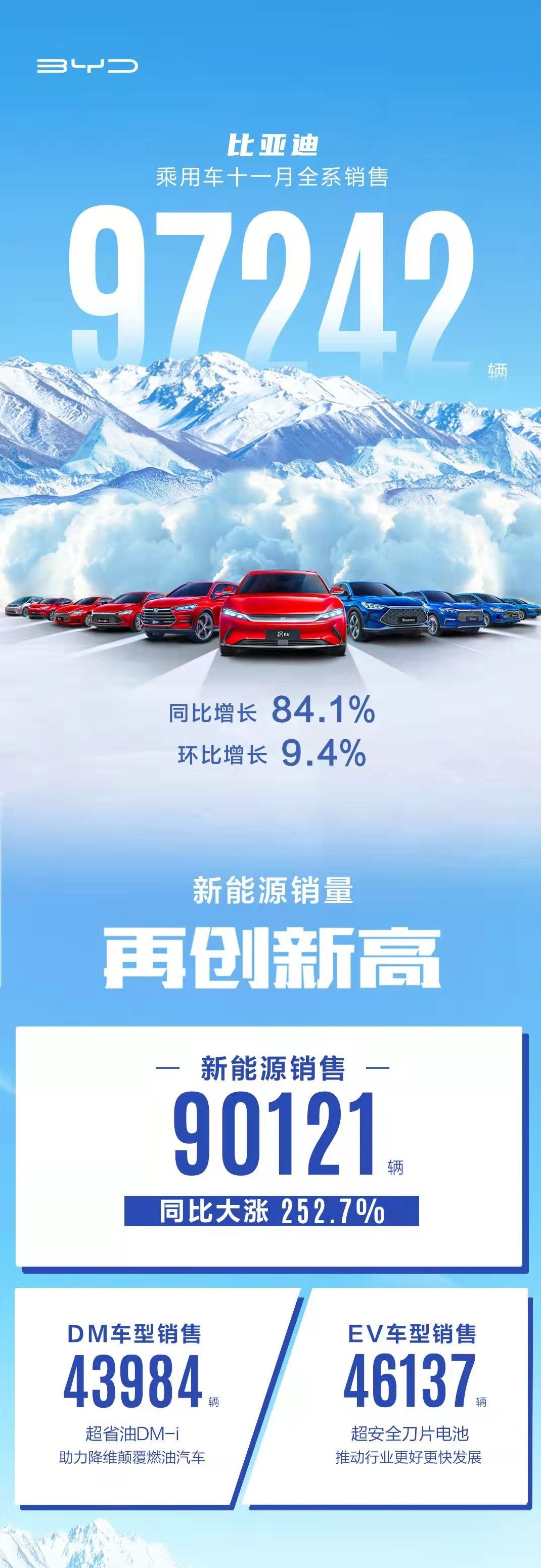 12月3日,比亚迪股份(01211)公布2021年11月产销快报,其中,新能源汽车11月产量为约9.18万辆,本年累计产量约51.51万辆,同比增长219.81%;11月销量约9.12万辆,这也是截止至目前的中国新能源乘用车月销新纪录,本年累计销量约50.98万辆,同比增长216.97%。
