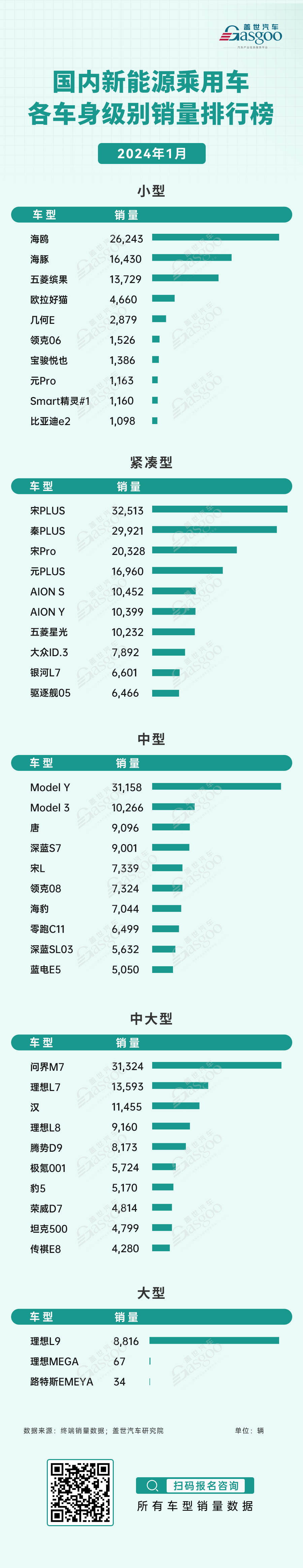 随着2024年1月国内新能源乘用车市场的尘埃落定,各大车型的销量排名也随之揭晓。小型车型的销量排行中,海鸥车型以26,243辆的销量荣登榜首,其出色的性能和市场认可度让它在众多车型中脱颖而出。紧随其后的还有海豚、五菱缤果、欧拉好猫、几何E、领克06等车型也在销量榜上占有一席之地。紧凑型的销量排行中,比亚迪凭借宋Plus、秦Plus、宋Pro与元Plus强势霸榜前四席位,而AION S与AION Y也表现不俗,分别占据榜单第五与第六。中型的销量排行中,Model Y以领先21,000辆的优势,将Model 3、唐、深蓝S7与宋L等一系列车型甩在身后。中大型榜单中,问界M7问界M7凭借卓越的性能和品质,销量领跑市场,达到惊人的31,324辆。理想L7和理想L8也表现出色,分别以13,593辆和9,160辆的销量紧随其后。最后,大型的销量排行中,理想L9以绝对的优势,凭借8,816辆的销量排在第一。(了解更多终端、预测销量,欢迎查看盖亚系统)