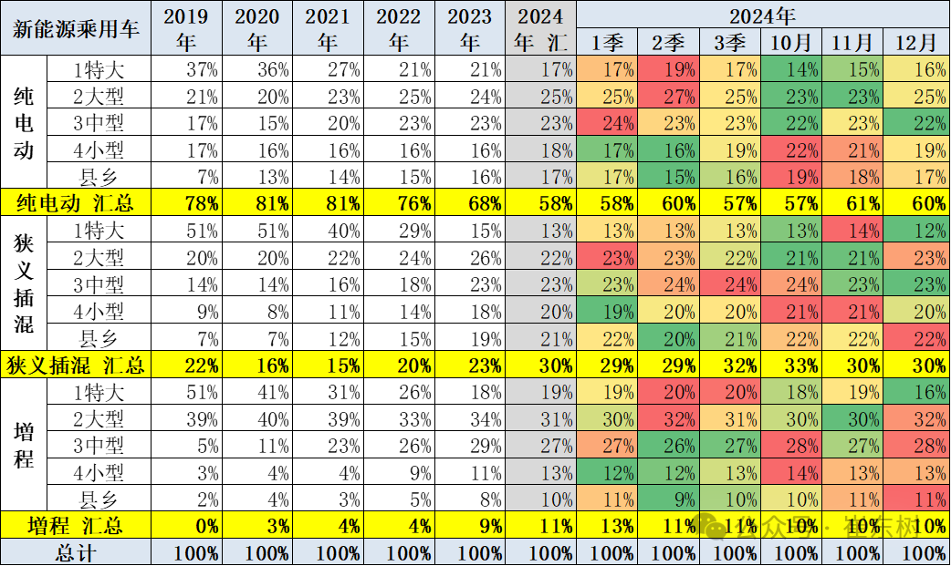 在油车还是电车的选项里,县城父老的抉择大抵也是如此。根据乘联会数据,2024年县乡纯电、插混、增程的销量比分别占全国销量的17%、21%、10%,比率仍有较大上升空间。