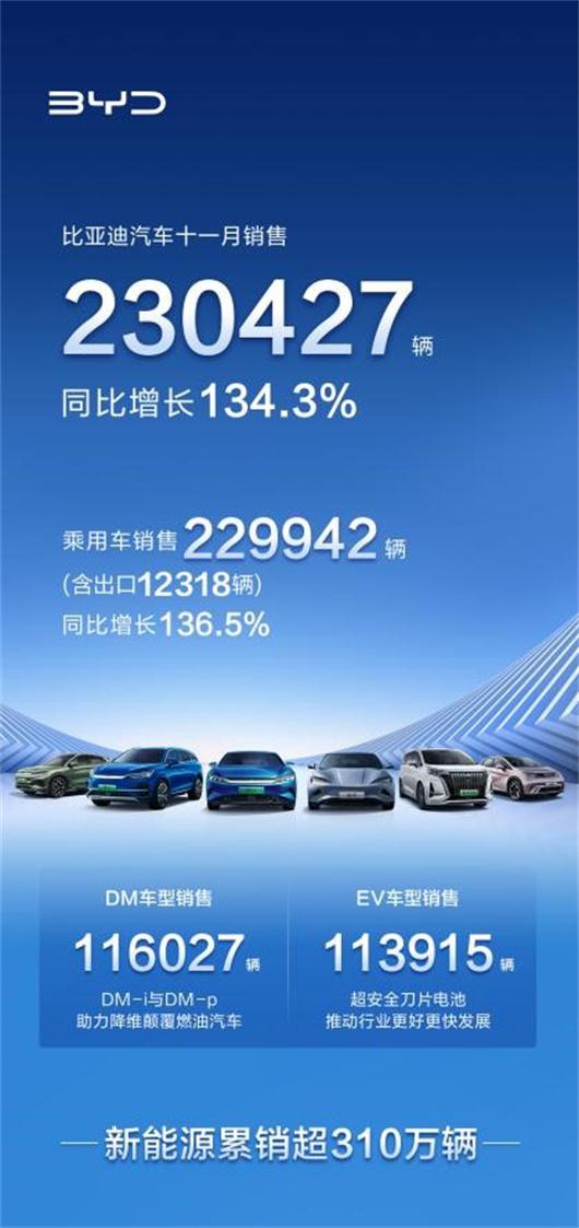 11月,比亚迪共销售新车230,427辆,继续创下历史新高。其中,乘用车包含出口在内共销售229,942辆,同比增长136.5%。