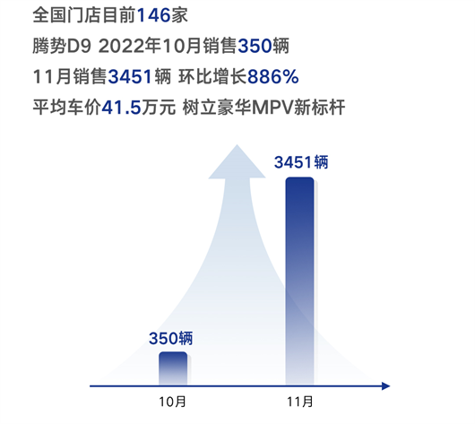 另外,经过焕新后的腾势,所推出的首款高端豪华MPV腾势D9,11月销量则达到3,451辆,环比增长886%,平均车价达到41.5万元。