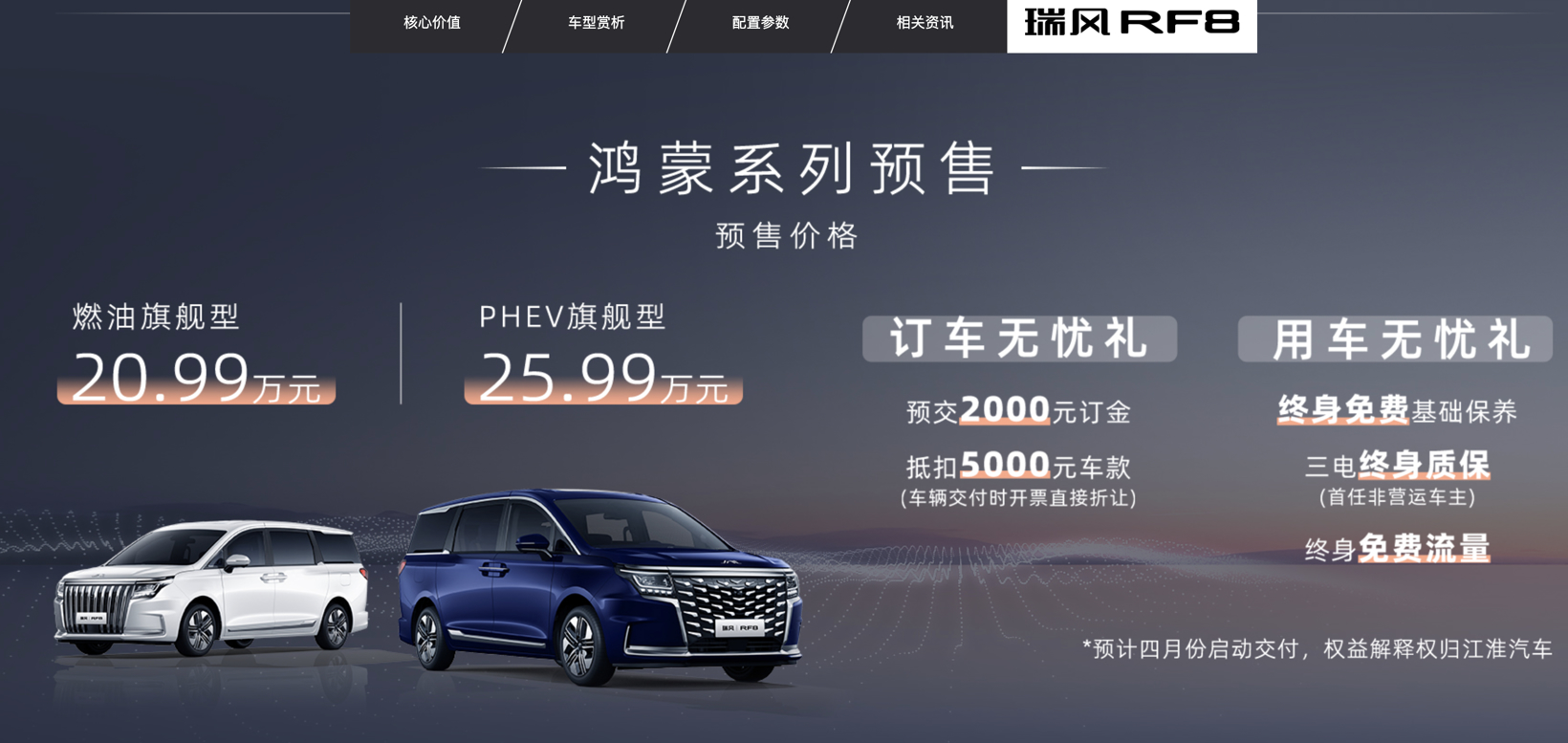 今年,自主高端MPV车型售价进一步下移。1月31日,江淮瑞风RF8上市,定位中大型电混动力MPV,售价区间为16.99万-23.99万元。即使是后续交付的鸿蒙车机插电版(4月交付),售价也仅为25.99万元,低于市场主流水平。