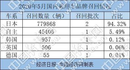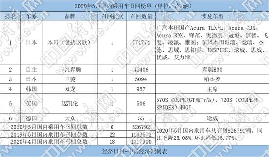 5月,国内乘用车市场共有7个品牌累计发布6起召回,共计召回汽车826792辆,同比下降25.08%,环比降低18.77%。其中,本田单次超77万辆的汽车召回,推升日系品牌占到召回总量的94.32%。