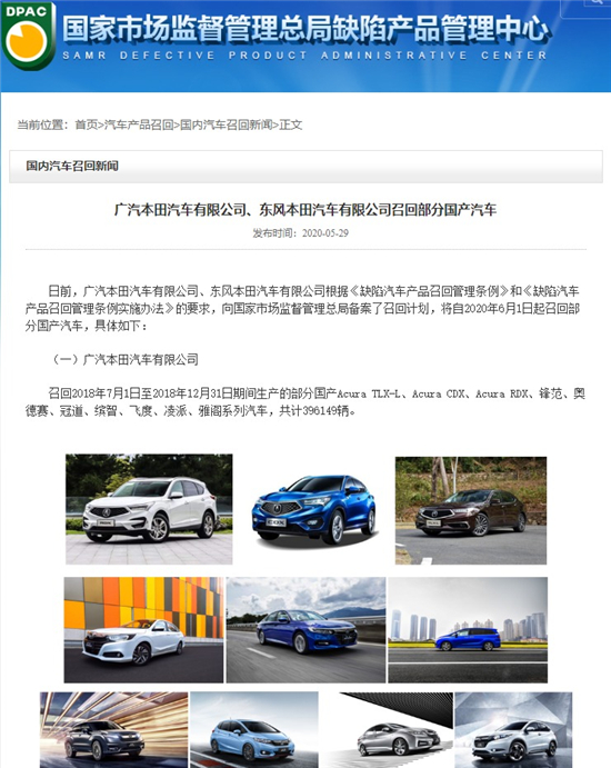 具体来看,日系品牌“一枝独秀”,共有779868辆汽车被召回,占到5月召回总量的94.32%。而本田一批次就召回多达774774辆汽车,占总量的93.71%,几乎涵盖了本田全系国产车型。其中,广汽本田召回396149辆,包括Acura TLX-L、Acura CDX、Acura RDX、锋范、奥德赛、冠道、缤智、飞度、凌派、雅阁等;东风本田召回378625辆,包括哥瑞、竞瑞、杰德、思域、思铂睿、INSPIRE、XR-V、CR-V、UR-V、艾力绅等。