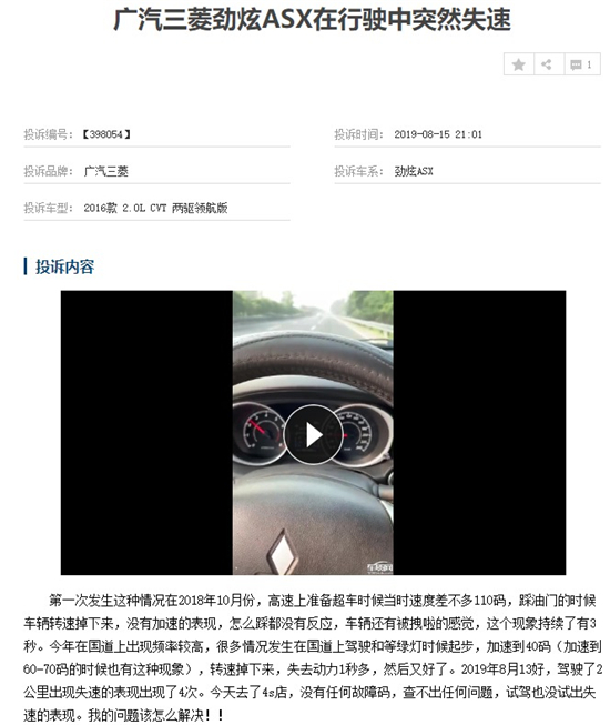 几乎与本田“失速门”同步,全国多地的长安马自达第二代CX-5车主也曾反映车辆在行驶中毫无征兆地熄火。而三菱,也早有消费者投诉车辆出现失速情况。一位广汽三菱劲炫车主就曾表示,“2018年10月,当时高速上速度约110码,踩油门准备超车时车辆转速掉下来,没有加速的表现,怎么踩都没有反应。此后失速情况更加频繁。”