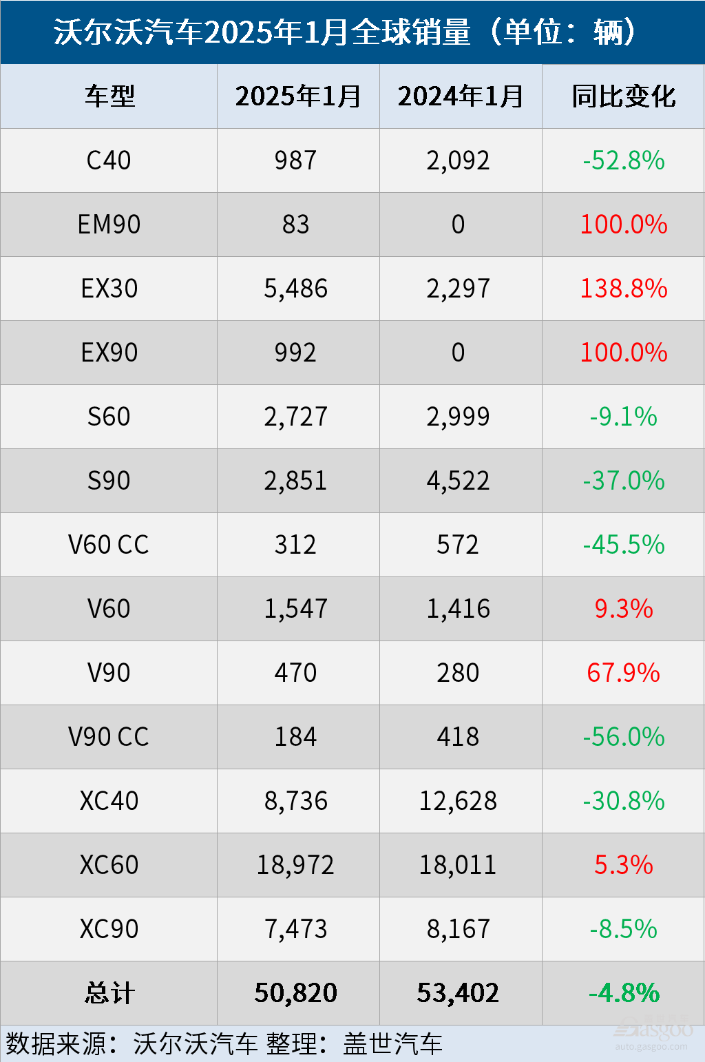 就车型来看,2025年1月,沃尔沃XC60成为该公司最畅销的车型,共售出18,972辆(2024年1月为18,011辆);其次是XC40/EX40,总销量为8,736辆(2024年1月为12,628辆);而XC90排在第三,总销量为7,473辆(2024年1月为8,167辆)。