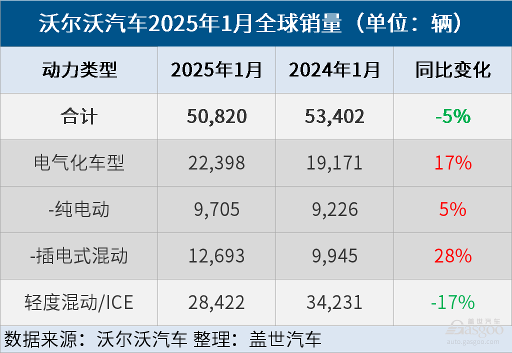 2025年1月,沃尔沃电气化车型(包括纯电动车型和插电式混合动力车型)的全球销量同比增长17%至22,398辆,占该公司当月全球总销量的44%。