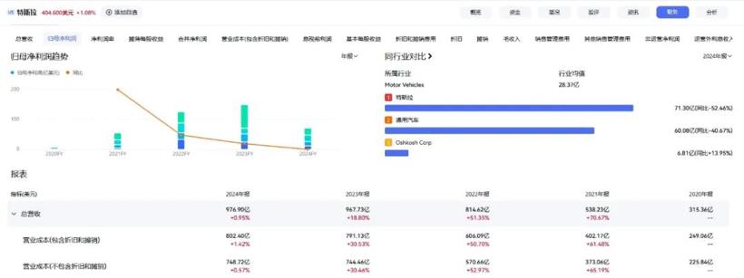 根据财报,公告显示公司2024财年净利润为71.30亿美元,同比减少52.46%;其中营业收入为976.90亿美元,同比增加0.95%,每股基本收益为2.23美元。Q4营收257亿,同比增长2%,但低于预期的272亿!净利润23亿,同比下降71%,核心汽车业务收入更是跌了8%!利润率创下多年新低,全靠卖碳排放额度来勉强撑住!