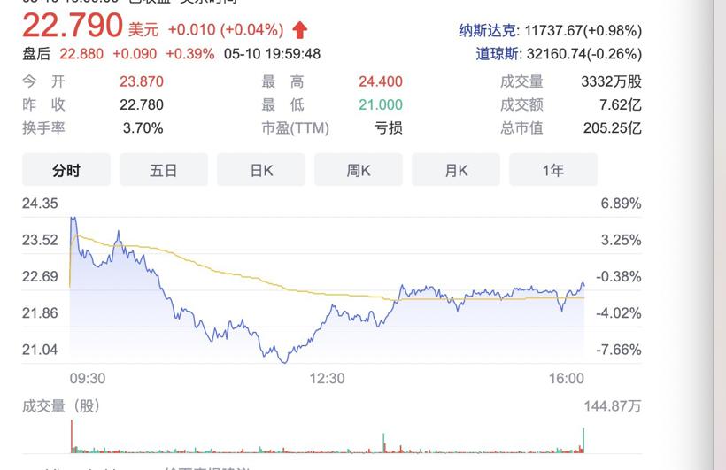 5月10日,历史被再度刷新,其股价跌20.88%,收盘价22.78美元。