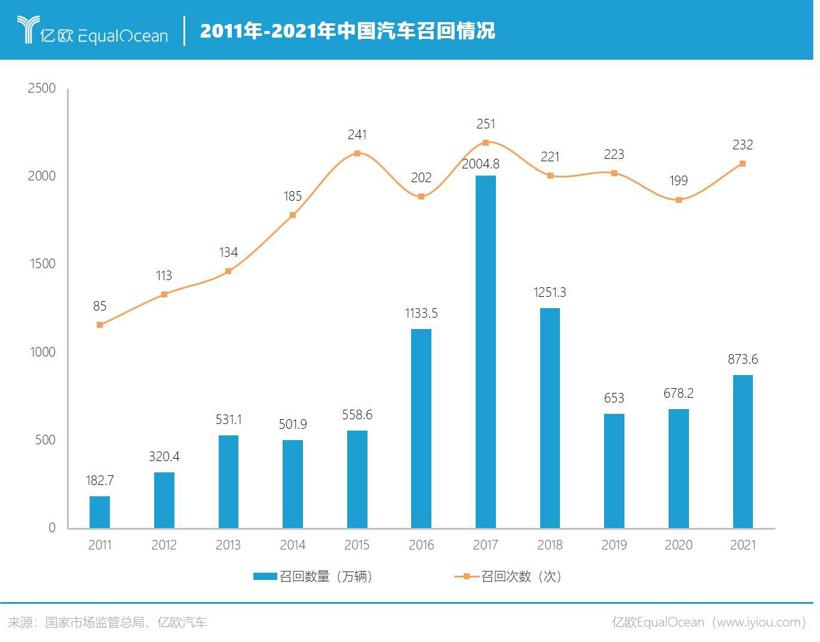 根据2022年3月国家市场监管总局发布的《市场监管总局关于2021年全国汽车和消费品召回情况的通告》,2021年,中国共实施汽车召回232次,涉及车辆873.6万辆,分别同比增长16.6%和28.8%。
