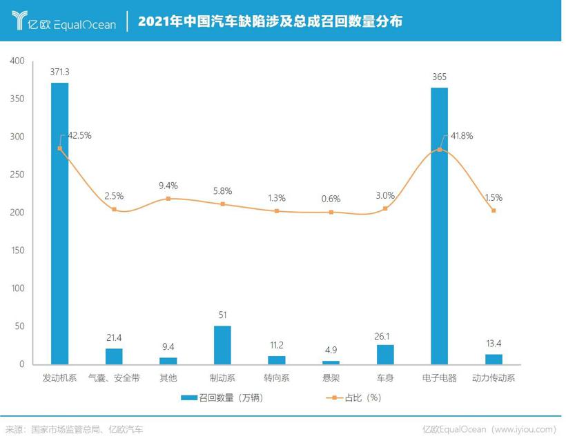 从缺陷涉及的总成看,发动机和电子电器系是主要缺陷产生部件,占总召回数量的84.3%。2021年,因发动机总成缺陷实施召回50次,涉及车辆371.3万辆,占总召回数量的42.5%;因电子电器缺陷实施召回54次,涉及车辆365万辆,占总召回数量的41.8%。