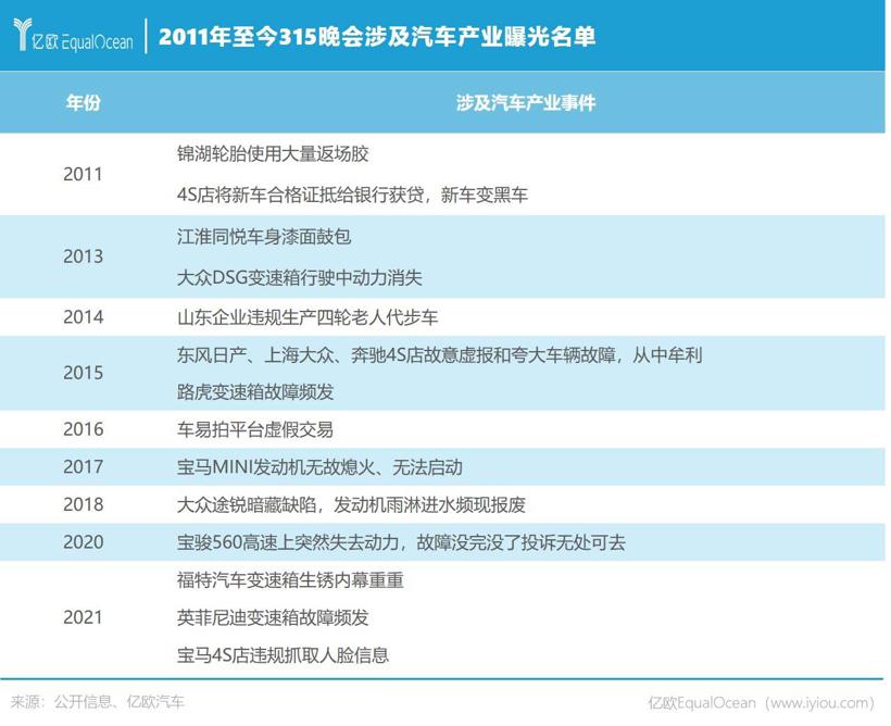 回顾历年来的315汽车产业曝光名单,大众、五菱、福特、英菲尼迪、宝马等车企均有上榜,大众、宝马更是“二进宫”。