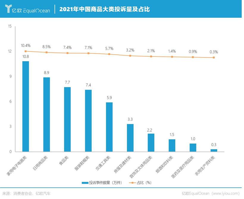 从中国消费者协会收到的投诉信息来看,根据中国消费者协会《2021年全国消协组织受理投诉情况分析》,2021年所有投诉中,商品类投诉为49.1万件,占总投诉量的47%,同比增长2.2%。其中交通工具类投诉量达5.9万件,位列第五,同比增长0.31%。