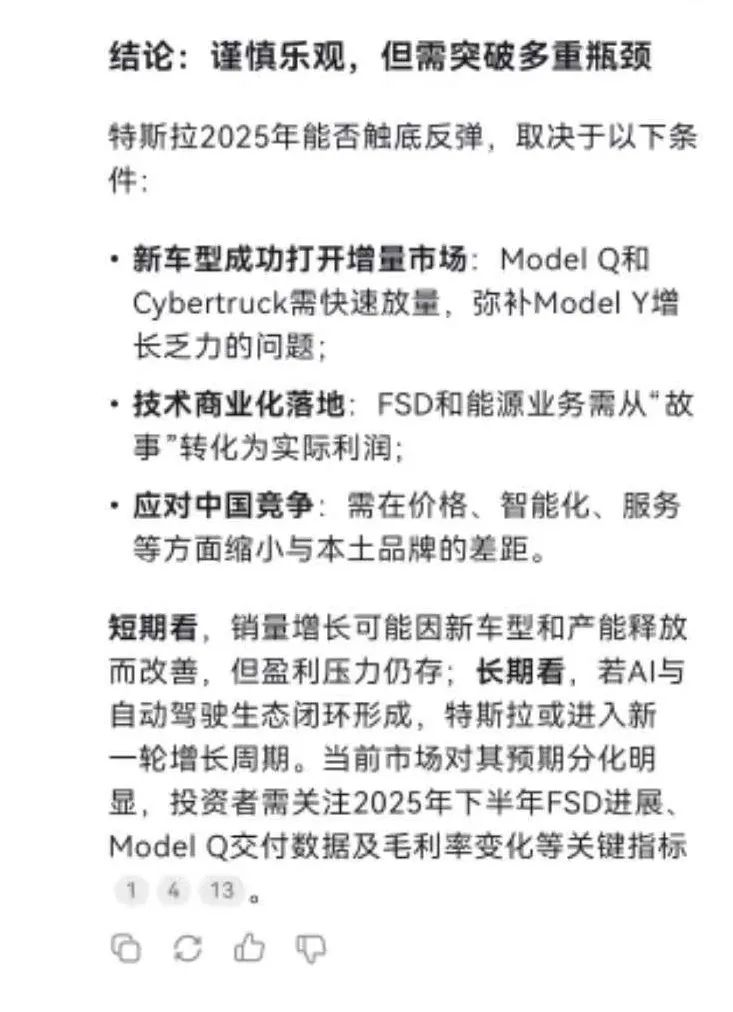 顺势,又一个问题抛给DeepSeek,“2025年的特斯拉能触底反弹吗?”
