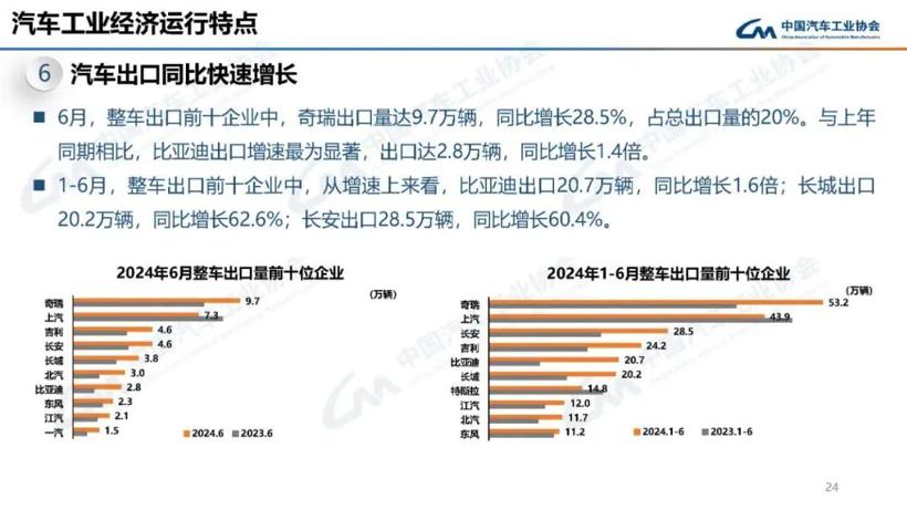 长安汽车上半年的出口量令人意外,以28.5万辆的出口成绩位列第三,同比2023年有60.4%的增长;吉利汽车紧随其后,半年完成24.2万辆的出口。7月初,吉利集团将年销量目标上调5%,这其中无疑包含了对出口的预期。