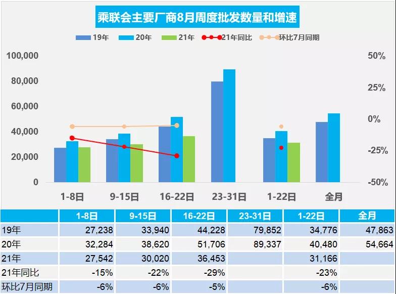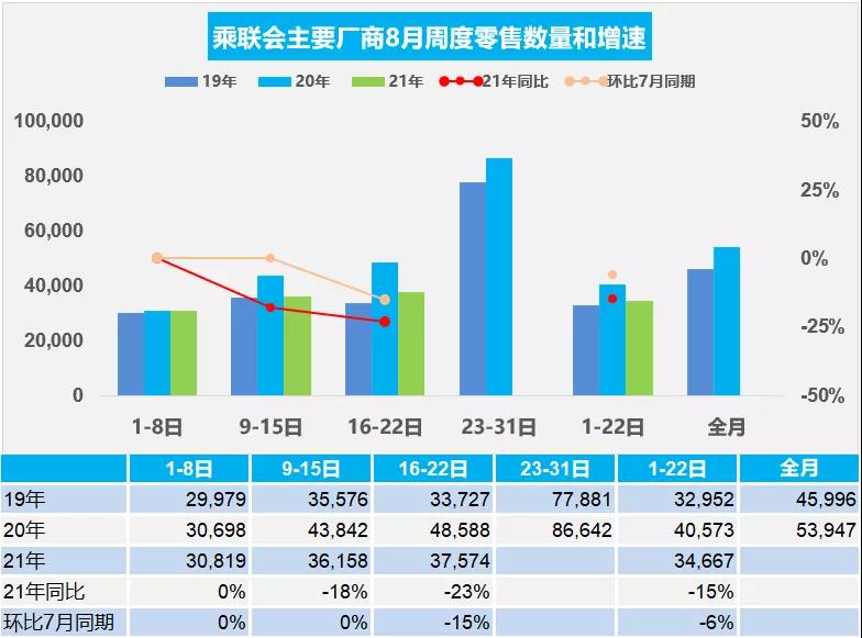 从乘联会发布主要厂商8月前三周批发和零售数据来看,无论是同比还是环比均出现下滑状态,零售量前三周总体同比下降15%,批发总体同比下降23%。