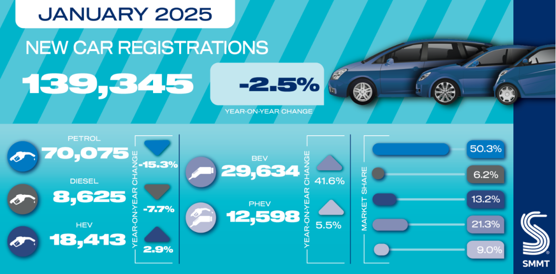 车轮征途讯 2月5日,SMMT的数据显示,由于消费者信心疲软和严峻的经济形势,英国1月新车销量同比下降2.5%至139,345辆,已连续第四个月下降。