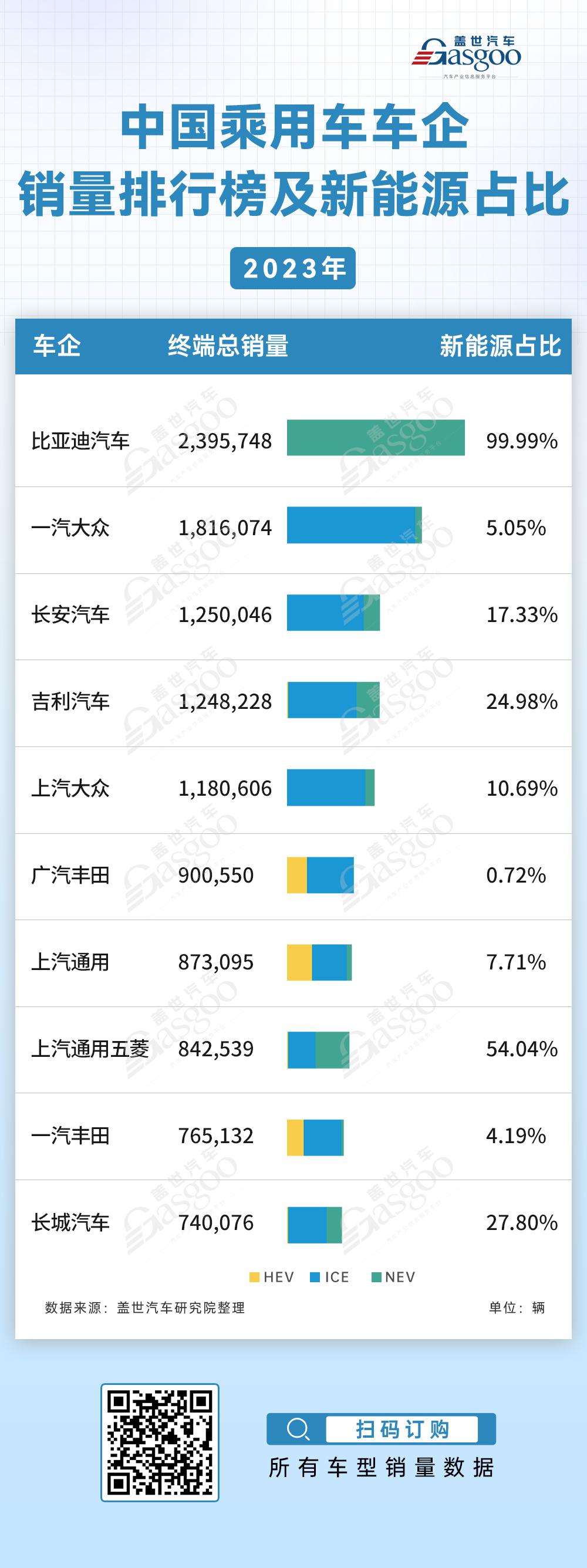 2023年中国乘用车车企销量排行榜及新能源占比图,则展示了终端销量TOP10车企在燃油、混动、新能源三种不同动力形式车型的销量占比情况,通过直观对比分析,帮助车企深入洞察消费者的购车偏好,了解竞争对手市场份额及未来汽车产业发展趋势,为车企制定生产和销售策略提供有力的数据支撑。