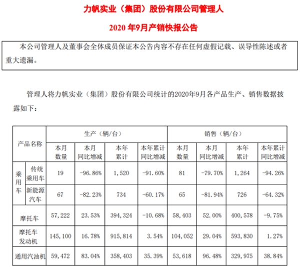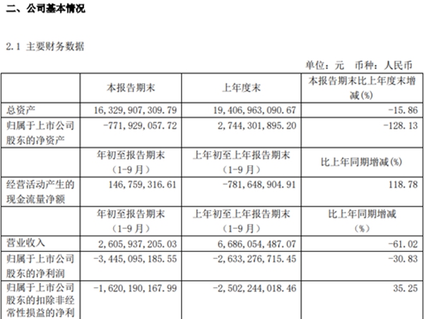 昨日,力帆实业(集团)股份有限公司(股票代码:601777)发布2020年三季度报告,公司营业收入、净利润、每股收益、净资产继续大幅下挫。具体来看,1-9月,公司营业收入为26.06亿元,同比下降61.02%;实现归属于上市公司股东的净利润亏损34.45亿元,同比下挫30.83%;基本每股收益为-2.64元/股,同比降低30.69%;归属于上市公司股东的净资产则为-7.72亿元。
