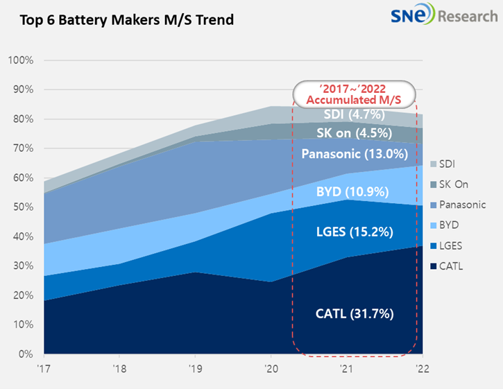 相比之下,日韩电池企业的成绩则稍显逊色。日本松下自2022年初开始就与榜单前三名无缘;韩国电池三巨头LG新能源、SK On和三星SDI电池装机量的同比增幅有所放缓,市场份额也较2021年有所下降,被中国二线电池厂商步步追赶。其中仅LG新能源就损失了6.1%的市场份额。