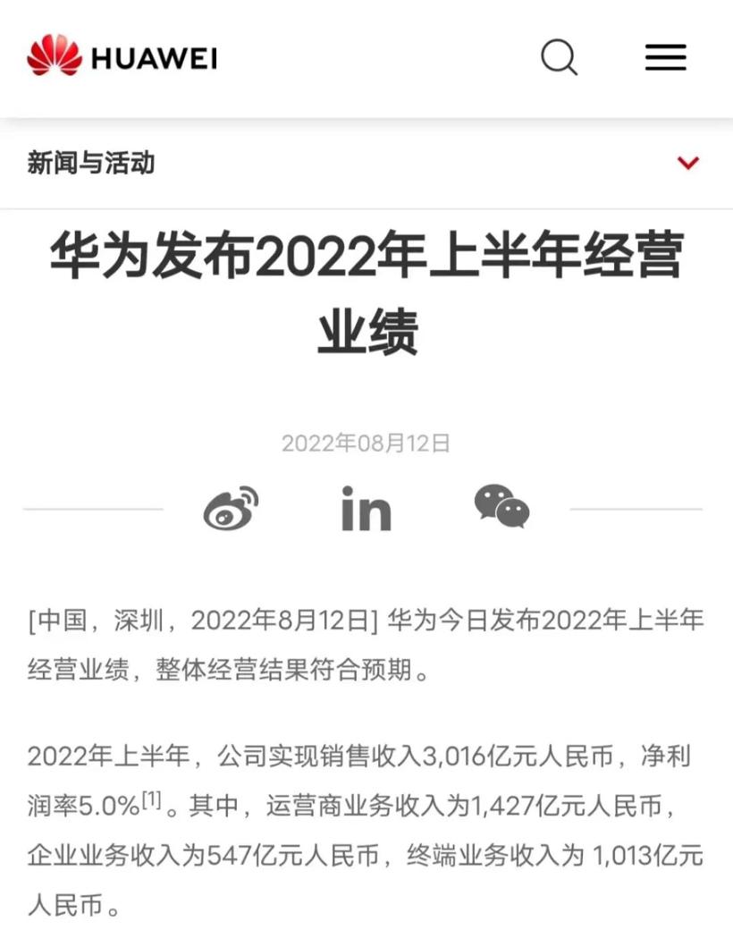过去1-6月,华为累计营收为3016亿元,和去年同期的3204亿元相比下滑了5.8%。虽然该公司没有公布最终的利润业绩,但是从5.0%的净利润率来看,华为上半年的净利润约在150.8亿元左右。