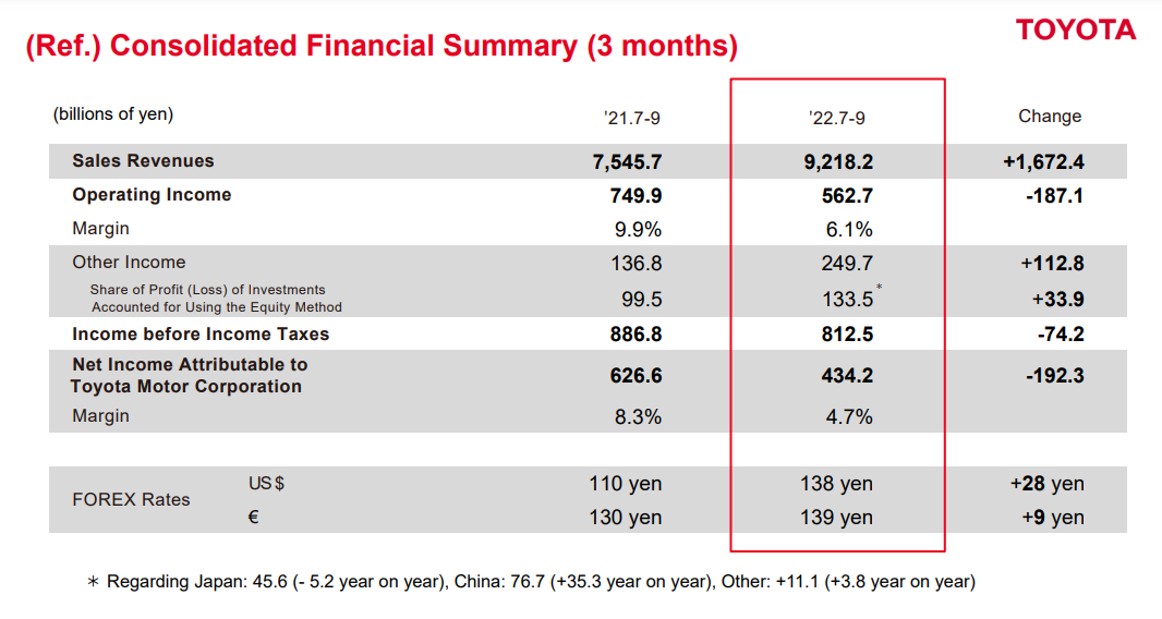 车轮征途讯 据外媒报道,11月1日,丰田汽车公布第三季度财报。由于零部件和材料成本飙升抵消了日元贬值带来的提振,丰田汽车第三季度营业利润同比下降25%,低于分析师预期。